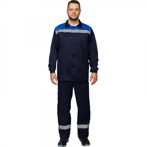 Костюм рабочий летний мужской Л16-КПК с СОП синий/васильковый (размер 64-66, рост 170-176) состоит из куртки и полукомбинезона. Он предназначен для использования в сельском хозяйстве, логистике, легкой промышленности, строительстве и озеленении. Основная ткань костюма - смесовая (80% полиэстер, 20% хлопок), плотность 190 г/кв.м. Ткань отличается прочностью и долговечностью. Куртка и полукомбинезон оснащены светоотражающими полосами шириной 5 см для обеспечения видимости в условиях низкой освещенности. Полукомбинезон имеет накладные карманы, гульфик на пуговицах, эластичную тесьму по талии спинки и регулируемые бретели. Куртка выполнена в прямом силуэте, застегивается на пуговицы, имеет контрастную кокетку и три накладных кармана для удобства. Защитные свойства: - Ми - защита от механических повреждений; - З - защита от загрязнений. Одежду рекомендуется стирать при температуре не выше 40 градусов. Не отбеливать, гладить при средней температуре. Стандарты: ГОСТ 12.4.280-2014, ТР ТС 019/2011.