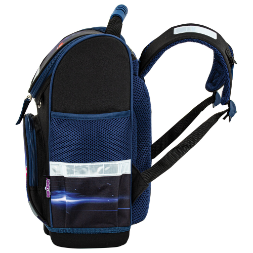 Жесткокаркасный ранец выполнен из прочного, износостойкого полиэстера. Ранец состоит из одного просторного отделения, одного переднего и двух боковых карманов.