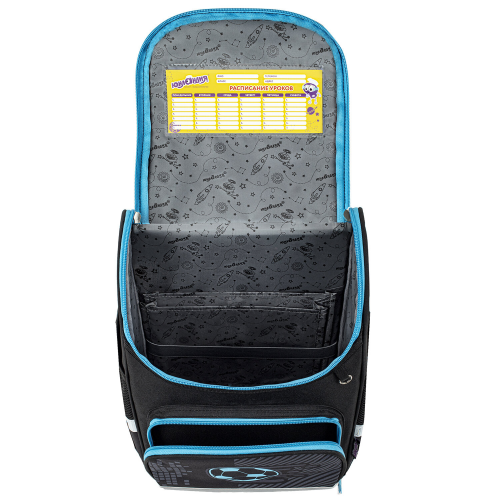 Внутренние разделители для книг и тетрадей в основном отделении позволяют правильно организовать пространство в ранце. Еще одна удобная опция – вкладыш для заполнения расписания уроков и контактной информации школьника на внутренней стенке крышки ранца.