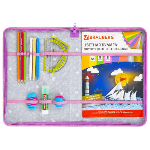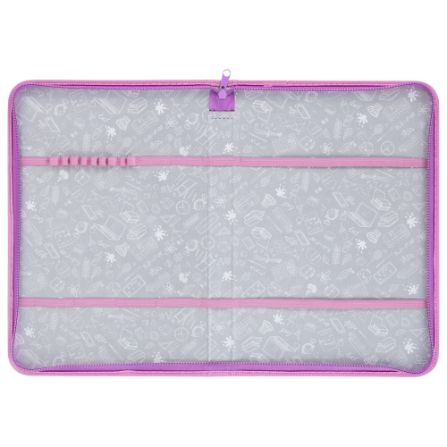 Задняя стенка папки выполнена из полиэстера, корпус - из плотного картона, по краям папка имеет тканевую окантовку. Внутри папки есть органайзер, который позволяет держать в порядке канцелярские и письменные принадлежности. Тканевая ручка с пластиковой вставкой внутри позволяет переносить папку в руке и вешать её на крючок под партой. Застегивается на молнию по периметру. Формат А4. Яркая и четкая печать дизайна.