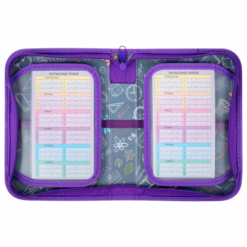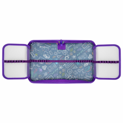 Внутри пенала на каждой створке прочные резинки для канцелярских принадлежностей, также пенал оснащен 2 откидными планками с органайзером и прозрачным кармашком для расписания уроков или таблицы умножения. Шаблон расписания уроков идет в подарок! Внутренняя часть выполнена из картона с глянцевой ламинацией с узором.