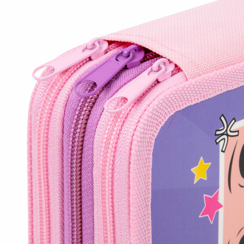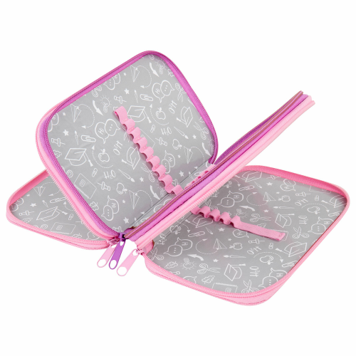 Пенал имеет 3 отделения, внутри на каждой створке имеются прочные резинки для канцелярских принадлежностей, внутренняя часть выполнена из картона с глянцевой ламинацией с узором.
