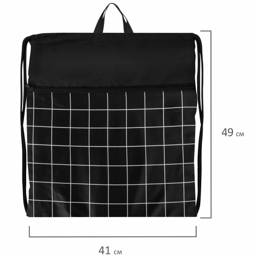 Мешок увеличенного размера 49х41 см имеет одно вместительное отделение, которое затягивается шнурками, а также дополнительное отделение на молнии спереди. На задней стенке основного отделения имеется сеточка для вентиляции содержимого. Большой размер мешка и два отделения позволяют использовать его для хранения высокой зимней обуви, а также для переноски и хранения физкультурной формы и вещей для факультативных занятий.