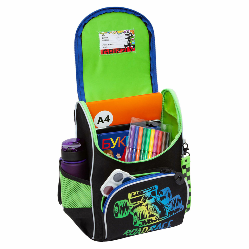 У ранца одно большое отделение с разделителем для учебных пособий формата А4. Ранец широко открывается, обеспечивая легкий доступ к содержимому. У него есть фронтальный карман на молнии для разных мелочей, удобная ручка и два вместительных боковых кармана. В комплекте к ранцу прилагается мешок для обуви.