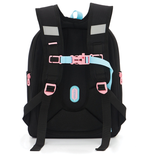 Чтобы у ребенка не уставали руки и плечи, ранец оснащен широкими лямками и нагрудной стяжкой со свистком.