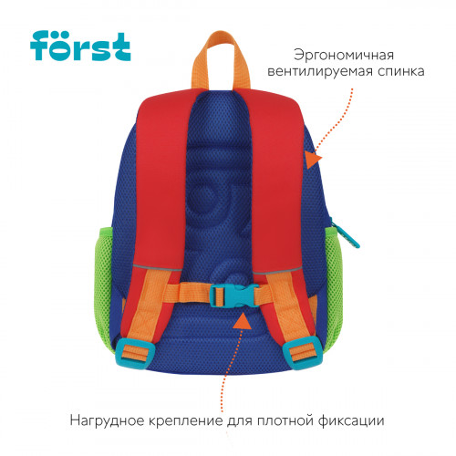 Детский рюкзачок Först серии F-Kids. Яркий дизайн не оставит равнодушным ни одного малыша. Его можно взять с собой на прогулку, на дополнительные занятия, в гости, в детский сад. Рюкзак имеет 1 основное отделение, передний карман на молнии, 2 боковых кармана из сетки, эргономичную спинку, покрытую мягким вентиляционным материалом. Нагрудное крепление плотно фиксирует рюкзак, не дает лямкам спадать с плеч во время движения. Усиленное дно и плотная ручка для переноски делают рюкзак максимально удобным.