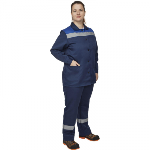 Костюм рабочий летний женский л16-КПК с СОП синий/васильковый (размер 60-62, рост 170-176 см). Куртка застегивается на пуговицы с потайной застежкой, по линии талии размещена регулируемая кулиса. Оснащен световозвращающей полосой шириной 5 см. Костюм изготовлен из смесовой ткани плотностью 190 г/кв.м. с водоотталкивающей пропиткой (20% хлопок, 80% полиэфир). Размер 60-62, рассчитан на рост 170-176 см. Сферы применения: сельское хозяйство, логистика, легкая промышленность, строительство, озеленение. Коллекция спецодежды л16 представлена женскими комплектами куртка и полукомбинезон л16-КПК-жен, а также мужскими брюками л16-БР, полукомбинезонами л16-ПК.