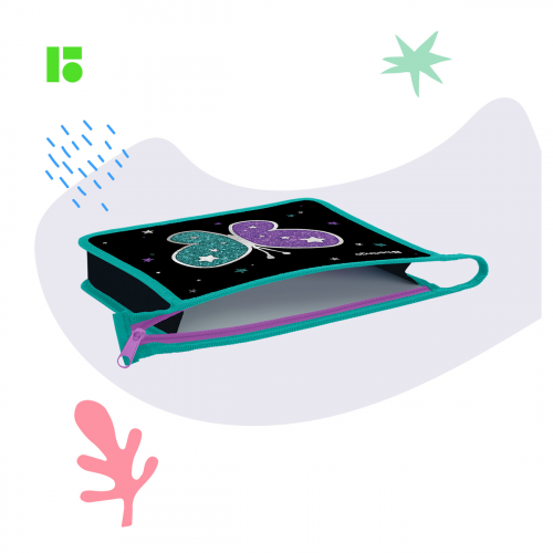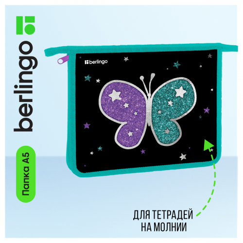 Папка для тетрадей на молнии Berlingo "Shining butterfly" формата А5 предназначена для хранения учебных принадлежностей. Изделие размером 240*205*40 мм состоит из одного отделения. Застёжка-молния сверху надежно защищает содержимое от грязи и влаги. Края папки имеют тканевую окантовку. Изготовлена из высококачественного пластика. Дизайн папки понравится девочке. • Формат: А5; • Материал: пластик; • Количество отделений: 1; • Тип застёжки: молния.