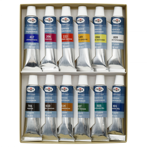 Краски акриловые художественные Гамма "Студия" "Юбилейная", 12цв, 18мл/туба, картон.упак.