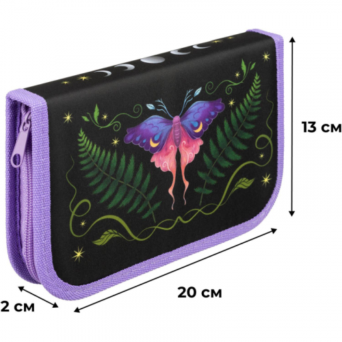 Пенал Комус Класс Сказочный лес - тканевый контейнер из полиэстера для хранения и транспортировки канцелярских принадлежностей. Дизайн пенала выполнен в черном и фиолетовом цветах с изображением волшебного леса. Предназначается для мальчиков младших и средних классов школы. Пенал размером 200x130x20мм имеет одну секцию (без наполнения). В нее с легкостью поместятся все необходимые для обучения инструменты.
