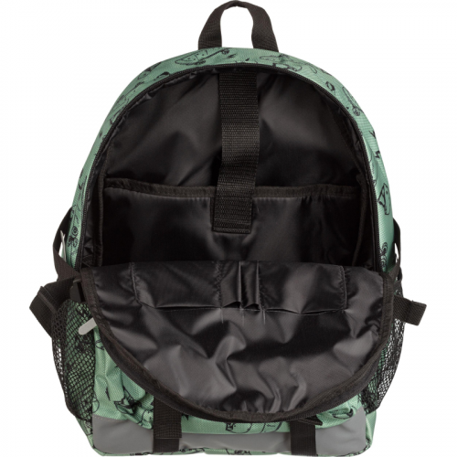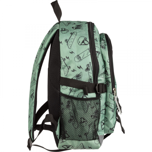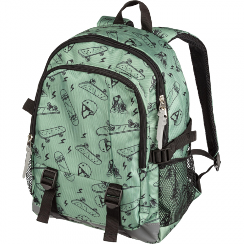 Рюкзак Комус Класс Скейт 15 л зелёныйЭргономичная сумка для переноса учебных материалов, предназначенная для учеников средних классов и студентов. Рюкзак выполнен из полиэстера и имеет одно отделение с тремя карманами для удобного хранения вещей. Дизайн сумки выполнен в сером и зелёном цветах с изображениями скейтбордов, что придаёт рюкзаку динамичный и стильный вид. Включает элементы светоотражения для дополнительной видимости.Размер рюкзака - 290x130x395 мм, подходит для повседневного использования. Он не вмещает предметы формата A4 и не имеет отделения для ноутбука. Вес рюкзака составляет 465 г, что делает его лёгким и удобным для ношения. Специального отделения для ноутбука нет.