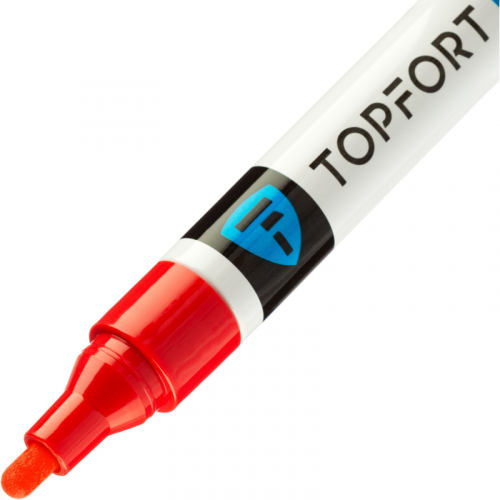 Маркер промышленный TOPFORT Industrial для универсальной маркировки красный (4 мм) предназначен для промышленной непрозрачной маркировки металла, стекла, пластика, дерева, резины, камня, картона, кирпича, текстиля, кожи (материал), бумаги, бетона. Краска содержит высококонцентрированный пигмент, хорошо ложится на гладкие и шероховатые поверхности. Может применяться для письма на жирных, пыльных, грязных поверхностях. После высыхания лаковые чернила устойчивы к воздействию света, атмосферных осадков, смазочных материалов, механическому истиранию. Создает стойкую линию толщиной 4 мм. Длина маркера - 143 мм. Цвет чернил : красный. Особенности: - Краска на усиленной нитро-основе РМ-14 (Великобритания). Без ксилола и толуола. - Устойчивый к износу усиленный акриловый круглый наконечник (Япония). - Толщина линии 4 мм. - Материал корпуса - алюминий. - Температурный режим использования : от 0 до +40 °С. - Температурный режим хранения: от 0 до +60 °С. - Температурная устойчивость надписи: от -60 до +350 °С. Инструкция по применению: 1. Перед использованием интенсивно встряхните маркер с закрытым колпачком. 2. Снимите колпачок, прижмите наконечник к поверхности, надавите до упора и удерживайте пока не проступит краска. 3. Применять после того как убедитесь, что наконечник полностью пропитан краской исходного цвета. Избегайте чрезмерного давления на наконечник при дальнейшем использовании. Предостережения: плотно закрывайте колпачок после применения, держать маркер вдали от источников тепла и воспламенения.