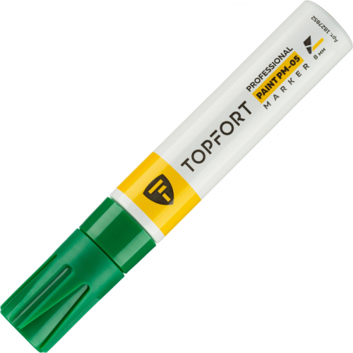 Маркер промышленный TOPFORT Paint для универсальной маркировки зеленый (8 мм) предназначен для промышленной непрозрачной маркировки металла, стекла, пластика, дерева, резины, камня, картона, кирпича, текстиля, кожи (материал), бумаги, бетона. Краска содержит высококонцентрированный пигмент, хорошо ложится на гладкие и шероховатые поверхности. Может применяться для письма на жирных, пыльных, грязных поверхностях. После высыхания лаковые чернила устойчивы к воздействию света, атмосферных осадков, смазочных материалов, механическому истиранию. Цвет чернил - зеленый, диаметр пишущего узла - 8 мм. Размеры маркера: диаметр 25 мм, длина 157 мм. Особенности: - Краска на нитро-основе РМ-05 (Великобритания). - Без ксилола и толуола. - Устойчивый к износу усиленный акриловый широкий скошенный наконечник (Япония). - Толщина линии 8 мм. - Материал корпуса - алюминий. - Клапанный механизм пишущего узла исключает растекание и разбрызгивание краски, преждевременное пересыхание маркера. - Температурный режим использования : от 0 до +40 °С. - Температурный режим хранения: от 0 до +60 °С. - Температурная устойчивость надписи: от -60 до +350 °С. Инструкция по применению: 1. Перед использованием интенсивно встряхнуть с закрытым колпачком. 2. Снимите колпачок, прижмите наконечник к поверхности, надавите до упора и удерживайте пока не проступит краска. 3. Применять после того как убедитесь, что наконечник полностью пропитан краской исходного цвета. Избегайте чрезмерного давления на наконечник при дальнейшем использовании. Предостережения: плотно закрывайте колпачок после применения, держать маркер вдали от источников тепла и воспламенения.