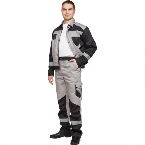 Костюм рабочий летний мужской л21-КБР с СОП серый/черный (размер 48-50, рост 194-200), состоит из куртки и брюк. Изготовлен из смесовой ткани (65% полиэстер, 35% хлопок) плотностью 240 г/кв.м с водоотталкивающей пропиткой (ВО). Светоотражающая полоса шириной 50 мм размещена на груди, спине, рукавах, а также внизу брюк. Куртка c застежкой на молнию и кнопки. На куртке два верхних накладных кармана. Рукава с налокотниками и манжетами. Ширина пояса куртки регулируется кнопками. Брюки прямого силуэта с застежкой на пуговицы. На передней половине брюк расположены два накладных кармана со скошенным входом. На брюках сзади 2 накладных кармана, один из которых на кнопке, а также боковой накладной карман на кнопке. Весь костюм сшит контрастными нитками белого цвета, двойной строчкой. Костюм предназначен для защиты от общих производственных загрязнений и механических воздействий. ГОСТ 12.4.280-2014, ТР ТС 019/2011. Сферы применения: сельское хозяйство, логистика, легкая промышленность, строительство, тяжелая промышленность. Коллекция рабочей одежды л21 представлена двумя видами комплектов: куртка и полукомбинезон л21-КПК, и куртка и брюки Л21-КБР.ЗАКОНОДАТЕЛЬНЫЕ И ТЕХНИЧЕСКИЕ ДОКУМЕНТЫ: