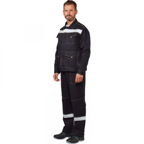 Костюм рабочий летний мужской л44-КПК с СОП синий/бежевый (размер 52-54, рост 170-176 см). Состоит из куртки и полукомбинезона. Состав ткани: 100% хлопок. Плотность материала: 320 г/кв.м. Куртка укороченная, с отложным воротником, с центральной потайной застежкой на пуговицы, пояс регулируется по ширине патами и пуговицами. Полукомбинезон прямого покроя, с центральной застежкой спереди, с усилительными накладками в области колен. Костюм с контрастными строчками и СОП шириной 50 мм.Костюм подходит для отраслей: сельское хозяйство, легкая промышленность, строительство. Стандарты: ГОСТ 12.4.280-2014; ТР ТС 019/2011.