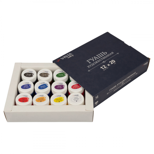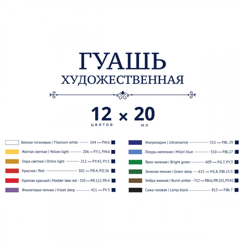Состав набора художественной гуаши 12 цветов по 20 мл