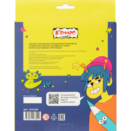 Карандаши цветные Комус Класс Максики 24 карандаша 24 цвета трёхгранные Цветные карандаши Комус Класс Максики подходят для школ, художественных кружков, занятий рисованием и домашнего использования. Трёхгранный корпус диаметром 7 мм обеспечивает удобство при использовании. Карандаш длиной 175 мм подходит для детей любого возраста. Диаметр грифеля - 3 мм. Грифель толстый, мягкий и плавно рисует, не царапая бумагу. Упаковка картонная коробка с европодвесом удобна для хранения и переноски. В наборе 24 шт. Количество цветов - 24. Тип упаковки - картонная коробка с европодвесом. Материал корпуса - дерево. Размер упаковки - 90x15x215 мм. Продукт применяется для рисования и развития творческих способностей детей.