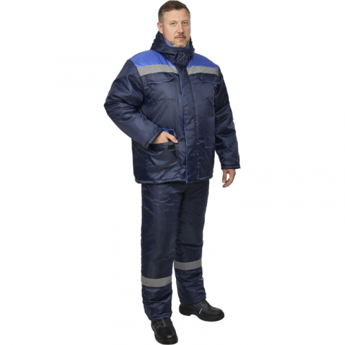 Костюм рабочий зимний мужской з12-КПК с СОП синий/васильковый из ткани (размер 52-54, рост 170-176). Рекомендован для использования в сельском хозяйстве, логистике, легкой промышленности, строительстве, озеленении. Изготовлен из ткани с водоотталкивающей пропиткой (100% полиэстер, плотность 100 г/кв.м). Утеплитель из синтепона, плотностью - 360 г/кв.м (основа) 3 слоя по 120 г/кв.м и 240 г/кв.м (руки/ноги) 2 слоя по 120 г/кв.м. Материал подкладки - 100% полиэстер. Защитные свойства: -Защищает от общих производственных загрязнений. -Защищает от пониженных температур. Куртка застегивается на молнию и контактную ленту, оснащена отстегивающимся регулируемым капюшоном и напульсниками, усиленными налокотниками, а также имеет нагрудные и боковые накладные карманы с клапанами, и внутренний карман. Полукомбинезон классического покроя с усилением в области колен и боковыми карманами, застегивается на молнию. Соответствует ГОСТ 12. 4. 303-2016. размер Цвет на изображении товара в интернет-магазине или в печатном каталоге может отличаться от оригинала из-за особенностей цветопередачи монитора. Законодательные и технические документы