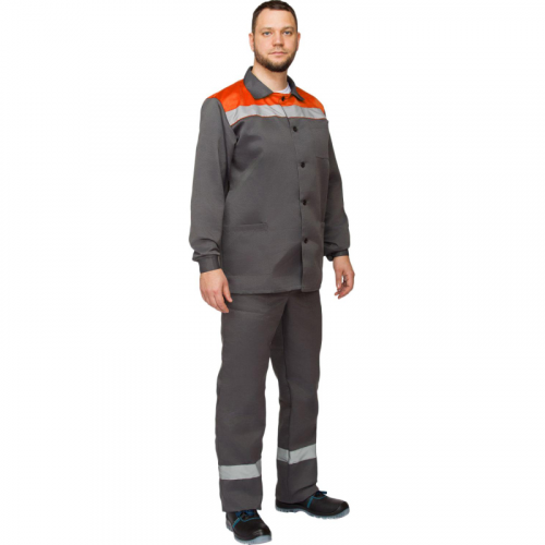 Костюм рабочий летний мужской л16-КПК с СОП серый/оранжевый (размер 64-66, рост 170-176) состоит из куртки и полукомбинезона. Изготовлен из смесовой ткани (80% полиэстер, 20% хлопок, плотность 190 г/кв.м.). Куртка и полукомбинезон оснащены светоотражающей полосой - 5 см. Полукомбинезон c накладными карманами, гульфиком на пуговицах, эластичной тесьмой по талии спинки и регулируемыми бретелями. Куртка прямого силуэта на пуговицах с контрастной кокеткой и тремя накладными карманами. Соответствует ГОСТ 12.4.280-2014, ТР ТС 019/2011. Сферы применения: сельское хозяйство, логистика, легкая промышленность, строительство, озеленение. Коллекция спецодежды л16 представлена комплектами куртка-брюки л16-КБР и куртка-полукомбинезон л16-КПК.