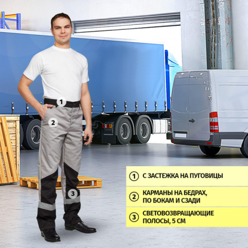 Костюм рабочий летний мужской л21-КБР с СОП серый/черный (размер 56-58, рост 158-164), состоит из куртки и брюк. Изготовлен из смесовой ткани (65% полиэстер, 35% хлопок) плотностью 240 г/кв.м с водоотталкивающей пропиткой (ВО). Светоотражающая полоса шириной 50 мм размещена на груди, спине, рукавах, а также внизу брюк. Куртка c застежкой на молнию и кнопки. На куртке два верхних накладных кармана. Рукава с налокотниками и манжетами. Ширина пояса куртки регулируется кнопками. Брюки прямого силуэта с застежкой на пуговицы. На передней половине брюк расположены два накладных кармана со скошенным входом. На брюках сзади 2 накладных кармана, один из которых на кнопке, а также боковой накладной карман на кнопке. Весь костюм сшит контрастными нитками белого цвета, двойной строчкой. Костюм предназначен для защиты от общих производственных загрязнений и механических воздействий. ГОСТ 12.4.280-2014, ТР ТС 019/2011. Сферы применения: сельское хозяйство, логистика, легкая промышленность, строительство, тяжелая промышленность. Коллекция рабочей одежды л21 представлена двумя видами комплектов: куртка и полукомбинезон л21-КПК, и куртка и брюки Л21-КБР.ЗАКОНОДАТЕЛЬНЫЕ И ТЕХНИЧЕСКИЕ ДОКУМЕНТЫ: