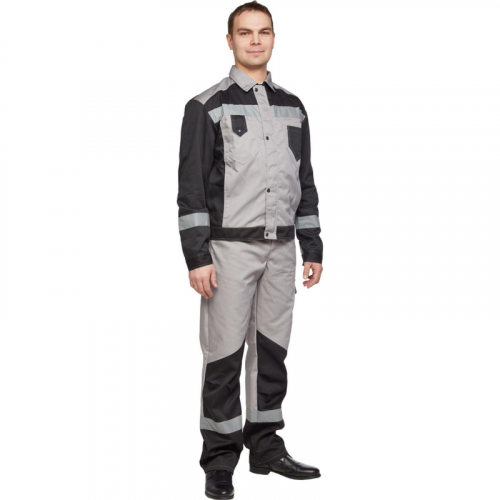Костюм рабочий летний мужской л21-КБР с СОП серый/черный (размер 60-62, рост 158-164), состоит из куртки и брюк. Изготовлен из смесовой ткани (65% полиэстер, 35% хлопок) плотностью 240 г/кв.м с водоотталкивающей пропиткой (ВО). Светоотражающая полоса шириной 50 мм размещена на груди, спине, рукавах, а также внизу брюк. Куртка c застежкой на молнию и кнопки. На куртке два верхних накладных кармана. Рукава с налокотниками и манжетами. Ширина пояса куртки регулируется кнопками. Брюки прямого силуэта с застежкой на пуговицы. На передней половине брюк расположены два накладных кармана со скошенным входом. На брюках сзади 2 накладных кармана, один из которых на кнопке, а также боковой накладной карман на кнопке. Весь костюм сшит контрастными нитками белого цвета, двойной строчкой. Костюм предназначен для защиты от общих производственных загрязнений и механических воздействий. ГОСТ 12.4.280-2014, ТР ТС 019/2011. Сферы применения: сельское хозяйство, логистика, легкая промышленность, строительство, тяжелая промышленность. Коллекция рабочей одежды л21 представлена двумя видами комплектов: куртка и полукомбинезон л21-КПК, и куртка и брюки Л21-КБР.ЗАКОНОДАТЕЛЬНЫЕ И ТЕХНИЧЕСКИЕ ДОКУМЕНТЫ: