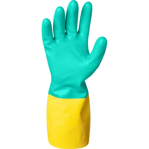 Перчатки КЩС латекс/неопрен Lakeland Neolasol ECR27F с хлопковым напыление синий/желтый (размер 10, ХL). Универсальные перчатки анатомической формы для работы с опасными химическими веществами широкого спектра. Обладают высокой стойкостью к химическим воздействиям. Изготовлены из латекса и неопрена путем двойного погружения, обеспечивают защиту от двойного спектра химических веществ. Внутренняя и внешняя части перчатки - разного цвета, что позволяет определить степень разъедания перчатки. Текстура 'зигзаг' способствует крепкому захвату мокрых предметов, с хлопковым напылением внутри перчатки обеспечивает комфорт. EN 388-2121Х: Истираемость: 2 (500 циклов). Стойкость к порезу: 1 ( 1,2 показатель). Сопротивление разрыву: 2 (25 Ньютонов). Сопротивление проколу: 1 ( 20 Ньютонов). EN 374-1 (AKL): Метанол (A): 2 из 6 (индекс защиты). Гидроксид натрия 40% (K) : 6 из 6 (индекс защиты). Серная кислота 96% (L): 5 из 6 (индекс защиты).