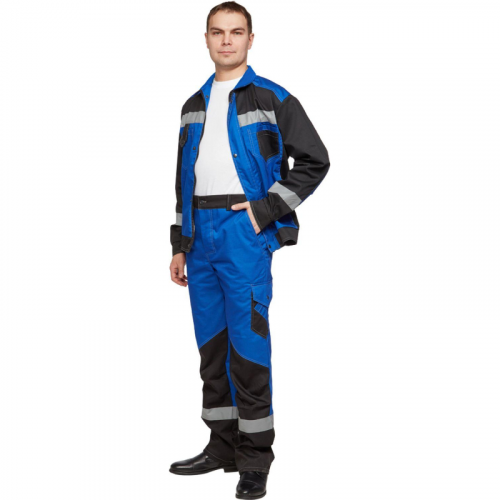 Костюм рабочий летний мужской л21-КБР с СОП васильковый/черный (размер 60-62, рост 158-164), состоит из куртки и брюк. Изготовлен из смесовой ткани (65% полиэстер, 35% хлопок) плотностью 240 г/кв.м с водоотталкивающей пропиткой (ВО). Светоотражающая полоса шириной 50 мм размещена на груди, спине, рукавах, а также внизу брюк. Куртка c застежкой на молнию и кнопки. На куртке два верхних накладных кармана. Рукава с налокотниками и манжетами. Ширина пояса куртки регулируется кнопками. Брюки прямого силуэта с застежкой на пуговицы. На передней половине брюк расположены два накладных кармана со скошенным входом. На брюках сзади 2 накладных кармана, один из которых на кнопке, а также боковой накладной карман на кнопке. Весь костюм сшит контрастными нитками белого цвета, двойной строчкой. Костюм предназначен для защиты от общих производственных загрязнений и механических воздействий. ГОСТ 12.4.280-2014, ТР ТС 019/2011. Сферы применения: сельское хозяйство, логистика, легкая промышленность, строительство, тяжелая промышленность. Коллекция рабочей одежды л21 представлена двумя видами комплектов: куртка и полукомбинезон л21-КПК, и куртка и брюки Л21-КБР.ЗАКОНОДАТЕЛЬНЫЕ И ТЕХНИЧЕСКИЕ ДОКУМЕНТЫ: