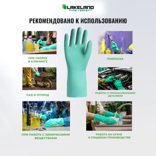 Перчатки КЩС нитриловые Lakeland Nitrosol EN15F с флокированным напылением зеленые (размер 10, ХL). Нитриловые перчатки анатомической формы, обладающие высокой степенью защиты от механических воздействий, предназначены для работы с агрессивными растворителями и нефтепродуктами (бензин, ароматические соединения, едкие и жирные кислоты в пищевой промышленности). Специально разработанное нитриловое соединение для стойкости к широкому спектру растворителей и химикатов на масляной основе. Легкая конструкция с подкладкой из флока для дополнительного комфорта и ловкости. Гипоаллергенны, могут использоваться для работы с пищевыми продуктами. EN 388:2016 (4101Х). Истираемость: 4 (8000 циклов). Стойкость к порезу: 1 (1,2 показатель). Сопротивление разрыву: 0 (< 10 Ньютонов). Сопротивление проколу: 1 (20 Ньютонов). EN ISO 374-5 (Type A). EN 374-1 (AJKLOT). Метанол (А): 2 из 6 (индекс защиты). Н-гептан (J): 6 из 6 (индекс защиты). Гидроксид натрия 40% (К): 6 из 6 (индекс защиты). Серная кислота 96% (L): 4 из 6 (индекс защиты). Гидроксид аммония 25% (O) : 6 из 6 (индекс защиты). Формальдегид 37% (Т): 6 из 6 (индекс защиты).