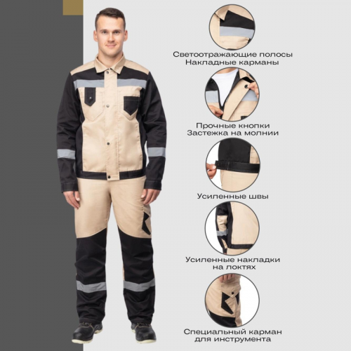 Спецодежда летняя костюм мужской л21-КБР состоит из куртки и брюк (размер 64-66, рост 170-176 см). Изготовлен из смесовой ткани (65% полиэстер, 35% хлопок) плотностью 240 г/кв.м с водоотталкивающей пропиткой (ВО). Светоотражающая полоса шириной 50 мм размещена на груди, спине, рукавах, а также внизу брюк. Куртка c застежкой на молнию и кнопки. На куртке два верхних накладных кармана. Рукава с налокотниками и манжетами. Ширина пояса куртки регулируется кнопками. Брюки прямого силуэта с застежкой на пуговицы. На передней половине брюк расположены два накладных кармана со скошенным входом. На брюках сзади 2 накладных кармана, один из которых на кнопке, а также боковой накладной карман на кнопке. Весь костюм сшит контрастными нитками белого цвета, двойной строчкой. Костюм предназначен для защиты от общих производственных загрязнений и механических воздействий. ГОСТ 12.4.280-2014, ТР ТС 019/2011. Сферы применения: сельское хозяйство, логистика, легкая промышленность, строительство, тяжелая промышленность.Коллекция рабочей одежды л21 представлена двумя видами комплектов: куртка и полукомбинезон л21-КПК и куртка и брюки Л21-КБР.ЗАКОНОДАТЕЛЬНЫЕ И ТЕХНИЧЕСКИЕ ДОКУМЕНТЫ: