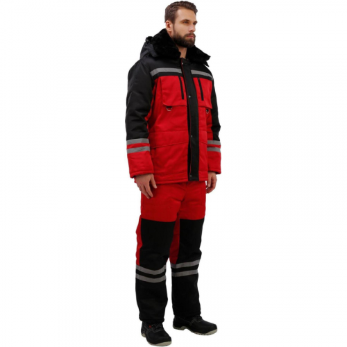 Костюм рабочий зимний мужской з03-КПК с СОП красный/черный (размер 48-50, рост 158-164). Рекомендован для использования в сельском хозяйстве, логистике, легкой промышленности, строительстве. Изготовлен из смесовой ткани с водоотталкивающей пропиткой (80% полиэстер, 20% хлопок), плотность ткани - 190 г/кв.м. Утеплитель из синтепона, плотностью - 360 г/кв.м (основа) 3 слоя по 120 г/кв.м и 240 г/кв.м (руки/ноги) 2 слоя по 120 г/кв.м. Материал подкладки - 100% полиэстер. Защитные свойства: -Защищает от общих производственных загрязнений. -Защищает от пониженных температур. Светоотражающая полоса размещена на груди, спине, рукавах, а также внизу полукомбинезона. Куртка с центральной застежкой на молнию, двумя ветрозащитными клапанами, съемным утепленным капюшоном, нижними прорезными и верхними накладными карманами. Полукомбинезон классического покроя с усилением в области колен и молниями по низу боковых швов. Соответствует ГОСТ 12. 4. 303-2016. размер Цвет на изображении товара в интернет-магазине или в печатном каталоге может отличаться от оригинала из-за особенностей цветопередачи монитора.