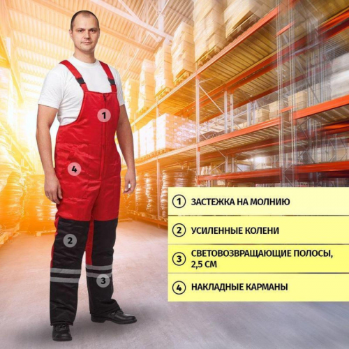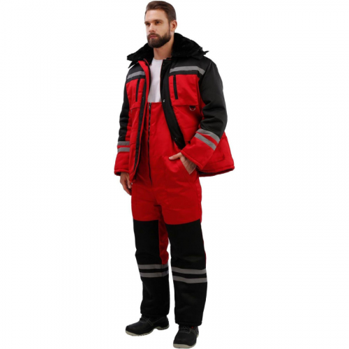Костюм рабочий зимний мужской з03-КПК с СОП красный/черный (размер 64-66, рост 170-176). Рекомендован для использования в сельском хозяйстве, логистике, легкой промышленности, строительстве. Изготовлен из смесовой ткани с водоотталкивающей пропиткой (80% полиэстер, 20% хлопок), плотность ткани - 190 г/кв.м. Утеплитель из синтепона, плотностью - 360 г/кв.м (основа) 3 слоя по 120 г/кв.м и 240 г/кв.м (руки/ноги) 2 слоя по 120 г/кв.м. Материал подкладки - 100% полиэстер. Защитные свойства: -Защищает от общих производственных загрязнений. -Защищает от пониженных температур. Светоотражающая полоса размещена на груди, спине, рукавах, а также внизу полукомбинезона. Куртка с центральной застежкой на молнию, двумя ветрозащитными клапанами, съемным утепленным капюшоном, нижними прорезными и верхними накладными карманами. Полукомбинезон классического покроя с усилением в области колен и молниями по низу боковых швов. Соответствует ГОСТ 12. 4. 303-2016. размер Цвет на изображении товара в интернет-магазине или в печатном каталоге может отличаться от оригинала из-за особенностей цветопередачи монитора.