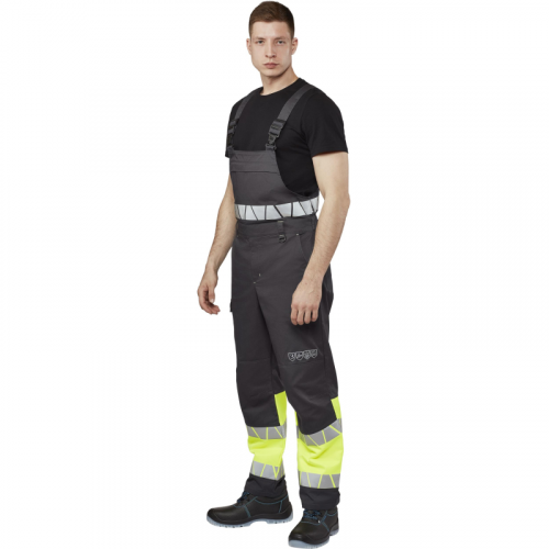 Полукомбинезон рабочий летний мужской Равелин с СОП лимонный/графит (размер 60-62, рост 182-188). Коллекция 'Равелин' - это одежда повышенной видимости, которая может служить и для защиты от общих производственных загрязнений и в качестве сигнальной спецодежды, для визуального обозначения присутствия носящих ее людей, при дневном освещении и ночью в свете автомобильных фар. Модель отличает высокое качество материалов и технологичный крой. В ее состав входят куртка, брюки, полукомбинезон. Элементы коллекции выполнены из смесовой ткани высокой прочности с масло-водоотталкивающей пропиткой, с повышенной стойкостью к истиранию, выцветанию и подходят для выполнения любых видов общепроизводственных работ. Защитные свойства: - Со - повышенная видимость - Ми - от механических воздействий (истирания) - З - от общих производственных загрязнений Особенности полукомбинезона: - Прямой силуэт - крой не сковывает движения. - Для дополнительной износостойкости - колени и усилены наколенниками с вытачками. - 6 функциональных карманов: два передних прорезных, два задних накладных и один накладной карман на правом бедре с клапаном на контактной ленте (липучке), большой прорезной карман на груди закрывается на молнию. - Предусмотрена индивидуальная регулировка ширины талии при помощи эластичной тесьмы. Имеются шлевки под ремень. - На передней шлевке металлическое полукольцо для крепления бейджей, пропусков или ключей. - Длина бретелей регулируется при помощи эластичной тесьмы и фастексов; - Застежка гульфика на молнию. Боковая застежка на пуговицы. - Визуальные элементы защиты - световозвращающий термопринт шириной 50 мм., 350-400 кд. на нижних частях брюк, на поясе и над левым наколенником (в виде пиктограмм). В случае использования в составе комплекта куртка + брюки/полукомбинезон модели 'Равелин', по площади светоотражающих элементов и флуоресцентной ткани костюм соответствует III классу сигнальной защиты.