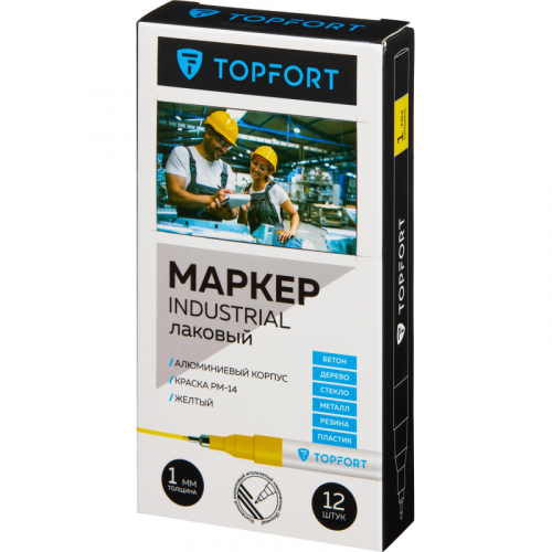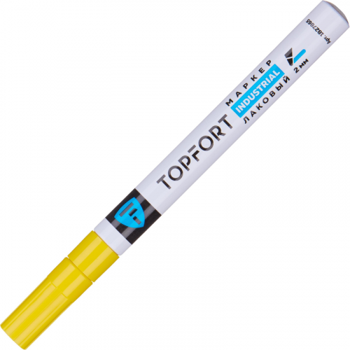 Маркер промышленный TOPFORT Industrial для универсальной маркировки желтый (2 мм) предназначен для промышленной непрозрачной маркировки металла, стекла, пластика, дерева, резины, камня, картона, кирпича, текстиля, кожи (материал), бумаги, бетона. Краска содержит высококонцентрированный пигмент, хорошо ложится на гладкие и шероховатые поверхности. Может применяться для письма на жирных, пыльных, грязных поверхностях. После высыхания лаковые чернила устойчивы к воздействию света, атмосферных осадков, смазочных материалов, механическому истиранию. Создает стойкую линию толщиной 2 мм. Длина маркера - 130 мм. Цвет чернил : желтый. Особенности: - Краска на усиленной нитро-основе РМ-14 (Великобритания). Без ксилола и толуола. - Устойчивый к износу усиленный акриловый круглый наконечник (Япония). - Толщина линии 2 мм. - Материал корпуса - алюминий. - Температурный режим использования : от 0 до +40 °С. - Температурный режим хранения: от 0 до +60 °С. - Температурная устойчивость надписи: от -60 до +350 °С. Инструкция по применению: 1. Перед использованием интенсивно встряхните маркер с закрытым колпачком. 2. Снимите колпачок, прижмите наконечник к поверхности, надавите до упора и удерживайте пока не проступит краска. 3. Применять после того как убедитесь, что наконечник полностью пропитан краской исходного цвета. Избегайте чрезмерного давления на наконечник при дальнейшем использовании. Предостережения: плотно закрывайте колпачок после применения, держать маркер вдали от источников тепла и воспламенения.