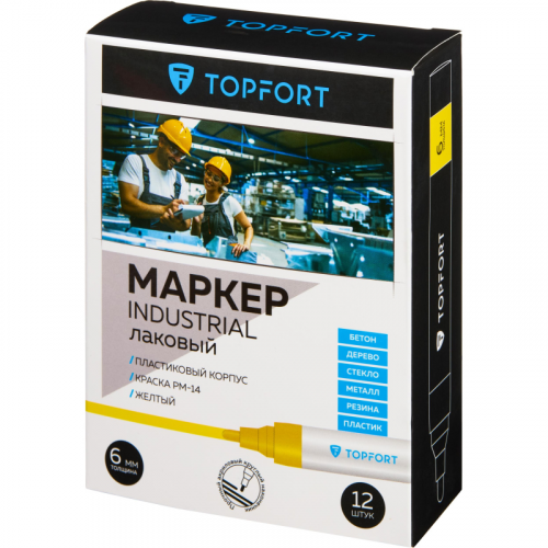 Маркер промышленный TOPFORT Industrial для универсальной маркировки желтый (6 мм) предназначен для промышленной непрозрачной маркировки металла, стекла, пластика, дерева, резины, камня, картона, кирпича, текстиля, кожи (материал), бумаги, бетона. Краска содержит высококонцентрированный пигмент, хорошо ложится на гладкие и шероховатые поверхности. Может применяться для письма на жирных, пыльных, грязных поверхностях. После высыхания лаковые чернила устойчивы к воздействию света, атмосферных осадков, смазочных материалов, механическому истиранию. Создает стойкую линию толщиной 6 мм. Длина маркера - 142 мм. Цвет чернил : желтый. Особенности: - Краска на усиленной нитро-основе РМ-14 (Великобритания). Без ксилола и толуола. - Устойчивый к износу усиленный акриловый круглый наконечник (Япония). - Толщина линии 6 мм. - Материал корпуса - алюминий. - Температурный режим использования : от 0 до +40 °С. - Температурный режим хранения: от 0 до +60 °С. - Температурная устойчивость надписи: от -60 до +350 °С. Инструкция по применению: 1. Перед использованием интенсивно встряхните маркер с закрытым колпачком. 2. Снимите колпачок, прижмите наконечник к поверхности, надавите до упора и удерживайте пока не проступит краска. 3. Применять после того как убедитесь, что наконечник полностью пропитан краской исходного цвета. Избегайте чрезмерного давления на наконечник при дальнейшем использовании. Предостережения: плотно закрывайте колпачок после применения, держать маркер вдали от источников тепла и воспламенения.