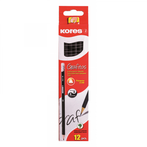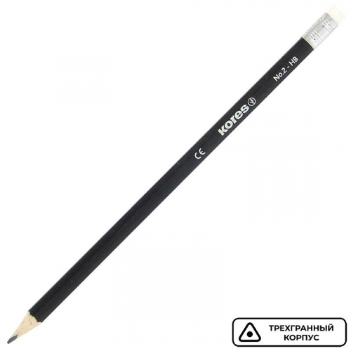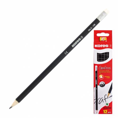 Карандаш чернографитный Kores в черном трехгранном деревянном корпусе. Простые карандаши с ластиком поставляются заточенными. Твердость грифеля HB. Высококачественный и прочный, грифель не сломается даже при падении и ударе. Длина карандаша 185 мм.