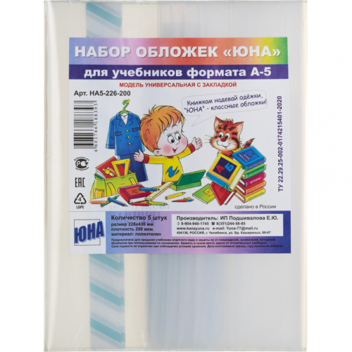 Набор обложек для учебников 226x430 мм 200 мкм (5 штук в упаковке Набор обложек предназначен для защиты учебников от пыли, влаги и механических повреждений. Использование обложек помогает сохранить аккуратный внешний вид в течение всего учебного года. Изготовлены из прозрачного полиэтилена плотностью 200 мкм. Все обложки в упаковке одного цвета, но цвет в ассортименте (без возможности выбора конкретного цвета). Благодаря наличию регулируемого по ширине второго клапана, обложки удобно использовать с учебниками разной ширины. Размер каждой обложки - 226x430 мм, в упаковке 5 штук.