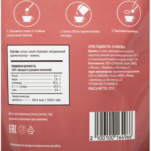 Какао-напиток ВкусВилл растворимый. Состав: сахар, какао-порошок, эмульгатор лецитин, соль пищевая, ароматизатор ванилин, аскорбиновая кислота (витамин С). Вес: 375 г. Срок годности: 24 месяца.
