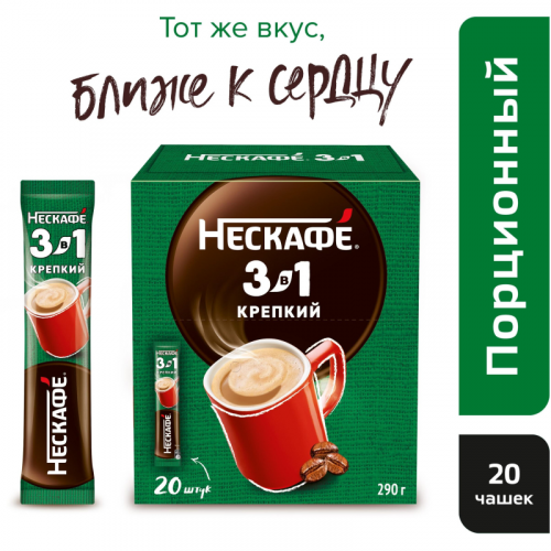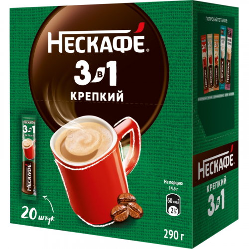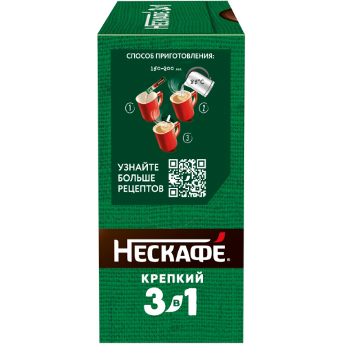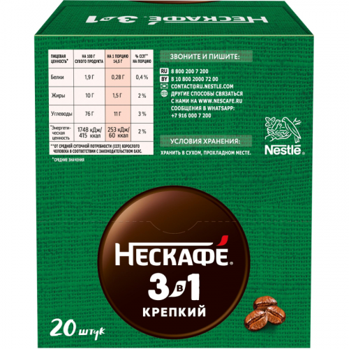 Nescafe 3в1 Крепкий - Вкусный перерыв где и когда угодно! Открой для себя интенсивный вкус и насыщенный аромат кофе, сливок и сахара в каждой чашке. Насыщенный и интенсивный вкус Nescafe 3в1 Крепкий отличный выбор для тех, кто предпочитает молочный кофе с горчинкой. Способ приготовления: Шаг 1. Высыпьте содержимое порционного пакетика в чашку; Шаг 2. Залейте горячей водой (150-200 мл), тщательно перемешайте; Шаг 3. Наслаждайтесь любимым напитком с насыщенным кофейным ароматом и сливочным вкусом. Удобный формат Nescafe в индивидуальной упаковке позволит насладиться любимым напитком где и когда угодно. Он всегда будет кстати, куда бы вы ни отправились: В офис; На учебу; В путешествие; На встречу с родными. Попробуйте также другие продукты из линейки кофе Nescafe 3в1: Nescafe 3в1 Классический - сбалансированный и насыщенный вкус. Nescafe 3в1 Мягкий - нежный сливочный вкус. Впервые кофе Nescafe был выпущен в 1938 году в Швейцарии. С тех пор наши эксперты продолжают совершенствовать технологии производства и обеспечивают разнообразие ассортимента кофе Nescafe. На фабрике ООО ?Нестле Кубань?, где производится кофе Nescafe, производственные отходы не отправляются на полигон, а обрабатываются, обезвреживаются и утилизируются. Также фабрика использует электроэнергию из возобновляемых источников с заботой об окружающей среде. Условия хранения: в сухом, прохладном месте. Состав: сахар, глюкозный сироп, масло пальмоядровое, кофе натуральный растворимый Nescafe, стабилизаторы (E340(ii), E331(iii), E452(i), E471, E472e), молочный белок, агент антислеживающий (E170), соль, регулятор кисоты (E330). СТО 48432921-002-2016.