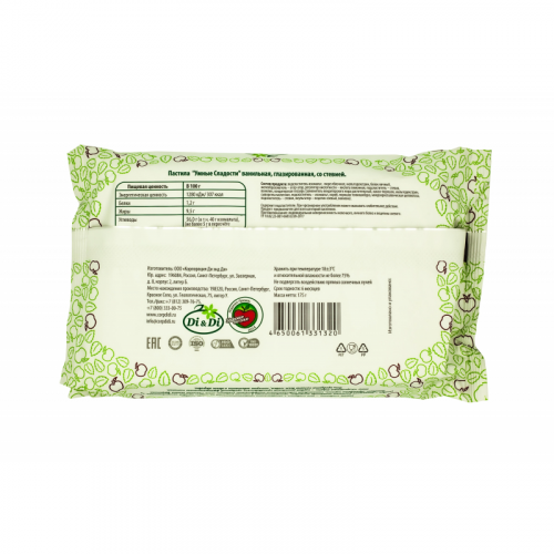 Пастила ванильная "Умные сладости" без сахара в глазури - вкусное, очень полезное и малокалорийное лакомство. Производится на основе натурального яблочного пюре. Нежная, в меру сладкая пастила с нежным ароматом ванили. Состав: подсластитель изомальт, патока, кондитерская глазурь (заменитель кондитерского жира лауриновый, какао-порошок, мальтодекстрин, сыворотка молочная, подсластитель -изомальт, порошок плодов рожкового дерева, порошок топинамбура, микрокристаллическая целлюлоза, подсластитель-экстракт стевии (стевиозид), эмульгатор - лецитин соевый, ванилин), пюре яблочное, мальтодекстрин, ароматизатор "ваниль", белок сухой яичный, желеобразователь-агар-агар, регулятор кислотности - кислота лимонная, ванилин, влагоудерживающий агент-лактатнатрия, загуститель - ксантановая камедь, подсластитель экстракт стевии (стевиозид). Белки - 1,2г. Жиры - 9,5г. Углеводы - 56,0г (в т.ч. изомальта 40 г, не более 5г в пересчете на сахарозу). В ста граммах продукта содержится не более 4,5 ХЕ Энергетическая ценность: 307ккал/1280 кДж Срок годности: 4 месяца. Условия хранения: при температуре не более 21 градуса Цельсия и относительной влажности не более 75%. Масса нетто: 160 грамм. Производитель: ООО "Корпорация "Ди энд Ди". Страна производства: Россия.