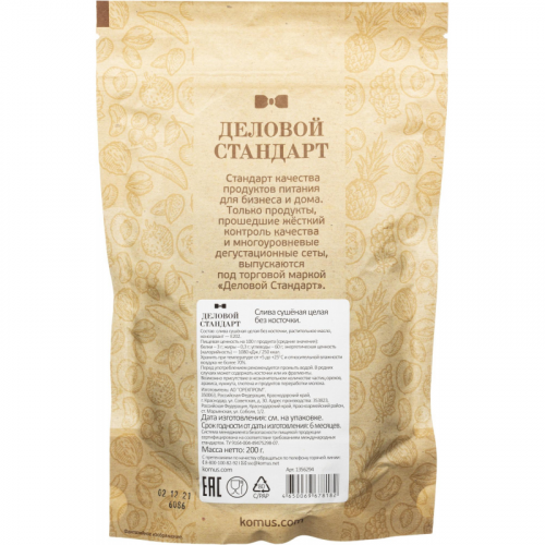 Чернослив Деловой Стандарт за счет огромного запаса витаминов разных групп, минералов и органических кислот, оказывает поддержку желудку и кишечнику, полезен для печени и почек, помогает укрепить сердце и способствует нормализации обмена веществ; Перед употреблением рекомендуется промыть водой. В редких случаях может содержать косточки или их фрагменты. Возможно присутствие в незначительном количестве частиц орехов, арахиса, кунжута, глютена и продуктов переработки молока. - Состав: слива сушеная целая без косточки, растительное масло, консервант - Е202. - Пищевая ценность в 100 г продукта (средние значения): белки - 3 г; жиры - 0,3 г углеводы - 60 г. - Энергетическая ценность/калорийность - 1080 кДж, 250 ккал. - Срок годности: 6 месяцев. - Условия хранения: Хранить при температуре от +5°C до +25°C и относительной влажности воздуха не более 70%. - Вес: 200 г. - Страна производства: Россия.