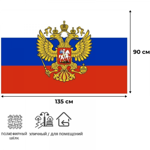 Флаг Российской Федерации с гербом 90x135 см 55 г/кв.м. Флаг Российской Федерации с гербом предназначен для использования в интерьере. Он идеально подходит для декора помещений, таких как офисы, залы для мероприятий, а также для создания патриотической атмосферы в домах. Этот флаг можно использовать для торжеств, юбилеев, государственных праздников и других значимых событий. Флаг изготовлен из полиэфирного шелка плотностью 55 г/кв.м. Размер флага составляет 90х135 см. Крепление осуществляется с помощью сквозного кармана на левой стороне (6 см) и двух петель. Цвет на изображении товара в интернет-магазине или в печатном каталоге может отличаться от оригинала из-за особенностей цветопередачи.