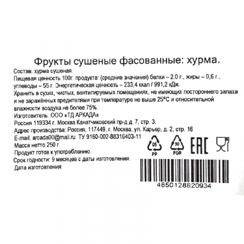 Хурма Аркада сушеная 250 г. Состав: хурма сушеная. Пищевая ценность на 100 г продукта: белки - 2 г, жиры - 0,5 г, углеводы - 55 г. Энергетическая ценность: 233,4 ккал, 991,2 кДж. Срок годности: 9 месяцев. Хранить в сухих, чистых, вентилируемых помещениях, не имеющих постороннего запаха и не зараженных вредителями при температуре не выше + 25°С и относительной влажности воздуха не более 75%. Страна производства Россия.