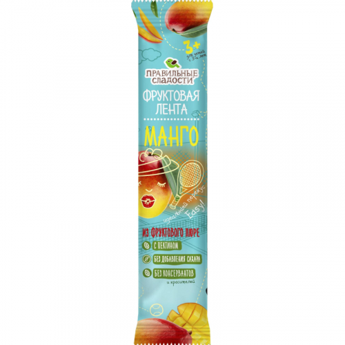 Манговая лента - натуральный продукт, изготовленный из яблочного и мангового пюре с добавлением пектина. Сертифицирована для детского питания с 3-х лет. Состав: пюре яблочное; концентрированный яблочный сок; концентрированный сок манго; желирующий агент: пектин; волокна пищевые цитрусовые; натуральный ароматизатор. Содержат сахара природного происхождения. Пищевая ценность: белки - 0,8 г, углеводы - 83 г. Энергетическая ценность: 1420 кДж, 340 ккал. Срок годности: 6 месяцев. Условия хранения: в чистых сухих помещениях при температуре не более +25°С. Масса нетто: 15 г (30 штук в упаковке). Производитель: АО "Кондитерская фабрика "Пермская", Россия.