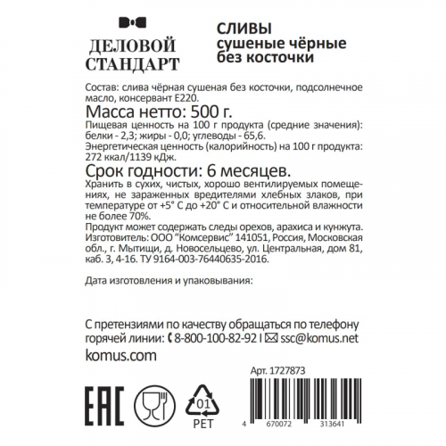 Чернослив "Деловой Стандарт" - полезный продукт без добавления сахара. Сливы тщательно отбираются по размеру и сушатся естественным способом на солнце. Чернослив содержит органические кислоты, клетчатку, пектиновые вещества, а также кальций, магний, фосфор и железо. Поэтому это отличный полезный перекус для взрослых и детей. Также сушеная слива применяется в кулинарии при приготовлении различных блюд и десертов. - Состав: сливы черные сушеные без косточки, подсолнечное масло, консервант Е220. - Пищевая ценность: белки - 2,3 г; жиры - 0,0 г; углеводы - 65,6 г. - Энергетическая ценность: 272 ккал/1139 кДж. - Срок годности: 180 дней. - Условия хранения: при температуре от + 5°С до + 20°С. - Вес: 500 г. - Страна производства: Россия.