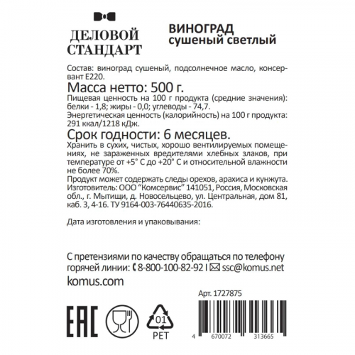Изюм Джамбо светлый "Деловой Стандарт" - это высушенные плоды винограда. Эта ягода сама по себе очень удивительная: после высушивания ее полезные свойства приумножаются в несколько раз. Ягоды перед сушкой проходят этап тщательной сортировки. Это ценный источник необходимых организму полезных веществ. Изюм богат белком, витаминами В, С, Е, К, калием, кальцием, магнием, железом, цинком. Отлично подходит для полезного перекуса взрослым и детям. - Состав: виноград сушеный, подсолнечное масло, консервант Е220. - Пищевая ценность: белки - 1,8 г; жиры - 0,0 г; углеводы - 74,7 г. - Энергетическая ценность: 291 ккал/1218 кДж. - Срок годности: 180 дней. - Условия хранения: при температуре от + 5°С до + 20°С. - Вес: 500 г. - Страна производства: Россия.