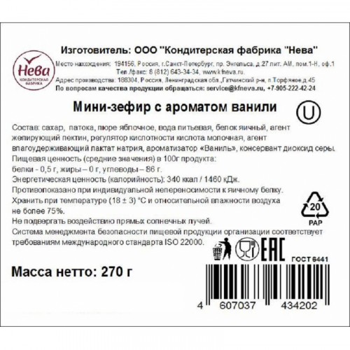 Мини-зефир со вкусом ванили, от Кондитерской Фабрики Нева. Лакомство с нежным ванильным вкусом, буквально тает во рту и дарит порцию сладкого настроения. Это замечательный десерт для праздничного стола и обычного семейного чаепития. В целях усовершенствования вкусовых и органолептических характеристик произведено увеличение доли яблочного пюре в составе. Увеличение массы фруктовой части повлекло за собой соответствующее снижение доли сахара в продукте, что, несомненно, является положительным изменением. Помимо улучшенных вкусовых характеристик, кондитерские изделия могут приобретать естественный светло-бежевый оттенок, что связано исключительно с повышенным содержанием яблочного пюре. Состав: сахар, патока, пюре яблочное, вода питьевая, белок яичный, агент желирующий пектин, регулятор кислотности кислота молочная, агент влагоудерживающий лактат натрия, ароматизатор ?Ваниль?, консервант диоксид серы. Пищевая ценность: белки - 0,5 г, жиры - 0 г, углеводы - 86 г. Энергетическая ценность: 340 ккал, 1460 кДж. Срок годности: 5 месяцев. Вес: 270 г. Хранить при температуре (18+-3)°C и относительной влажности воздуха не более 75%. Не подвергать воздействию солнечных лучей. Страна производства: Россия.