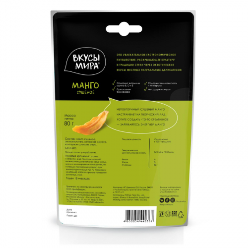 Неповторимый сушеный манго настраивает на творческий лад. Хотите создать что-то креативное - заряжайтесь энергией манго. Содержит витамины группы В, Д и Е. Приготовлен без сахара. Содержит аминокислоты и минералы. Не содержит жиров. Состав: манго сушеное, антиокислитель лимонная кислота, консервант диоксид серы. Пищевая ценность: белки - 1,00 г, жиры - 0,00 г, углеводы - 82,00 г. Энергетическая ценность: 1410 кДж, 330 ккал. Срок годности: 18 месяцев. Вес: 80 г. Хранить в закрытом виде при относительной влажности воздуха не более 75% в чистых, хорошо вентилируемых помещениях, не имеющих постороннего запаха, при температуре не выше +25°С (без резких колебаний). Избегать прямого попадания солнечных лучей. Страна производства: Тайланд.