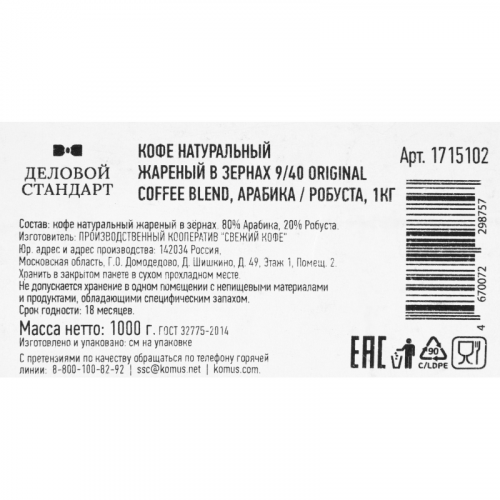 Кофе в зёрнах Деловой Стандарт 9/40 Original coffee blend 1 кг (пакет) Это результат работы сертифицированных бариста и судей кофейных чемпионатов. Зёрна для купажа собирают в Бразилии, Вьетнаме и Эфиопии. Бленд раскрывает изысканные нотки карамели, фундука и чернослива, что делает вкус напитка насыщенным и сбалансированным. Состав: смесь арабики и робусты. Смеси обжариваются под строгим контролем, что обеспечивает высокое качество и сохранение ароматических свойств. Степень обжарки - средняя. Заваривать кофе можно различными способами: в турке, кофеварке, френч-прессе, чашке или кофемашине. Для приготовления используйте 1-2 ч. л. молотого кофе на 50 мл воды. Кофе упакован в вакуумный пакет с клапаном для дегазации, что помогает сохранить свежесть продукта. Вес упаковки - 1000 г. Рекомендуется хранить в сухом прохладном месте при температуре до 27С и влажности не более 75%. Срок годности составляет 18 месяцев. Энергетическая ценность на 100 г: 3 ккал, белки - 0 г, жиры - 0 г, углеводы - 0 г. Внешний вид и/или характеристики товара могут быть изменены производителем в соответствии с производственным процессом.