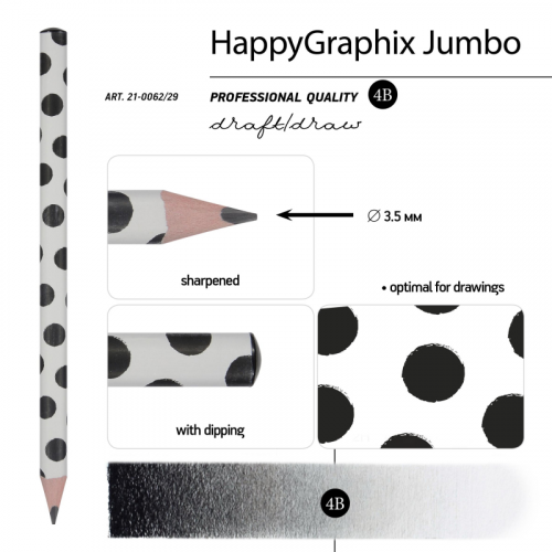 Карандаши "Happy Graphix Jumbo" - для тех, кто ценит эргономичность, качество и выразительность. Корпус карандаша произведен из термообработанной липы. Это идеальная древесина для производства карандашей, если речь идет об оптимальном сочетании цена-качество. Она не рассыхается при хранении, корпус не деформируется, а значит грифель надежно закреплен в нем. Карандаши из липы легко и беспроблемно поддаются заточке и ножом, и точилкой. Карандаш "Happy Graphix Jumbo" - трехгранный, имеет увеличенный диаметр, что обеспечивает его "правильный захват" тремя пальцами, снижая напряжение кисти. Такой карандаш не будет скатываться с поверхности стола. Увеличенный грифель диаметром 3,5 мм идеально отцентрован и проклеен, благодаря чему не ломается при падении карандаша и заточке. Степень жесткости 4B гарантирует мягкое скольжение карандаша по поверхности бумаги, яркую, контрастную линию. Оригинальные и ультрамодные принты на корпусе карандаша привлекают внимание, вызывают положительные эмоции.