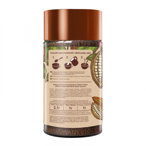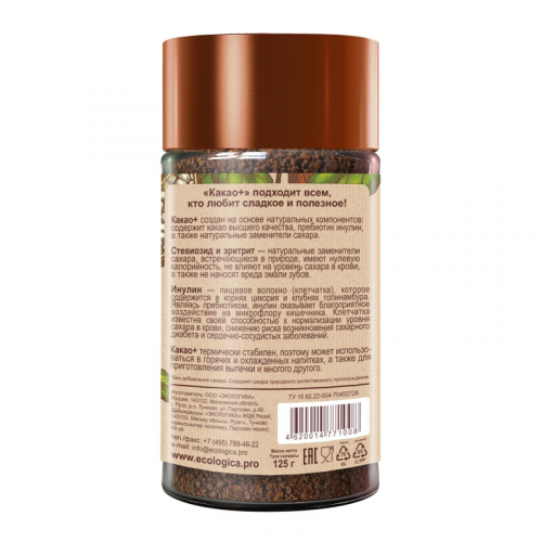 Создан без добавления сахара на основе натуральных компонентов: содержит какао высшего качества, пребиотик инулин, а также натуральные заменители сахара стевиозид и эритрит. Какао Плюс не содержит крахмала, сухих сливок/молока, поэтому идеально подходит всем, кто придерживается здорового образа жизни, а также веганам и людям с непереносимостью лактозы. Стевиозид и эритрит - имеют нулевую калорийность, не влияют на уровень сахара в крови, а также не наносят вреда эмали зубов. Инулин - пищевое волокно (клетчатка), оказывает благоприятное воздействие на микрофлору кишечника. Клетчатка известна своей способностью к нормализации уровня сахара в крови, снижению риска возникновения сахарного диабета и сердечно-сосудистых заболеваний. Какао Плюс термически стабилен, поэтому может использоваться в горячих и охлажденных напитках, а также для приготовления выпечки и многого другого! Состав: какао-порошок, подсластители (эритрит, стевиолгликозиды), инулин, ароматизатор (ванилин), эмульгатор (подсолнечный лецитин), соль. Вес упаковки: 125 г. Тип упаковки: стеклянная банка. Пищевая ценность на 100 г: жиры: 6.25, белки: 13.13, углеводы: 6.25. Энергетическая ценность (калорийность): 29 кКал/123 кДж. Условия или срок хранения: от 3°С до 25°С. Страна производства: Россия.